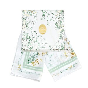 Το μαντίλι είναι προσεκτικά διπλωμένο μέσα σε χαρτί αφής με την ίδια εκτύπωση και τοποθετημένο σε πολυτελές κουτί με χρυσές πινελιές.